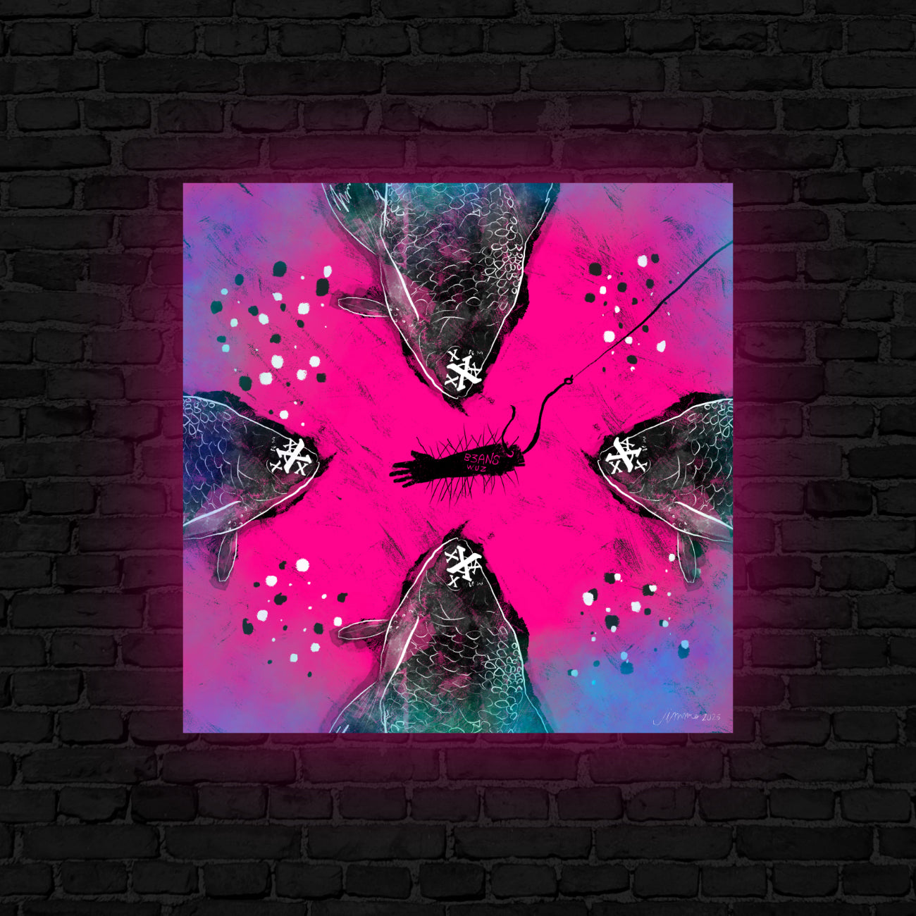 Rendered in a brutal palette of fluorescent magenta, inky blacks, and decaying blues, Food for the fishiessssss is part fever-dream, part underwater transmission.